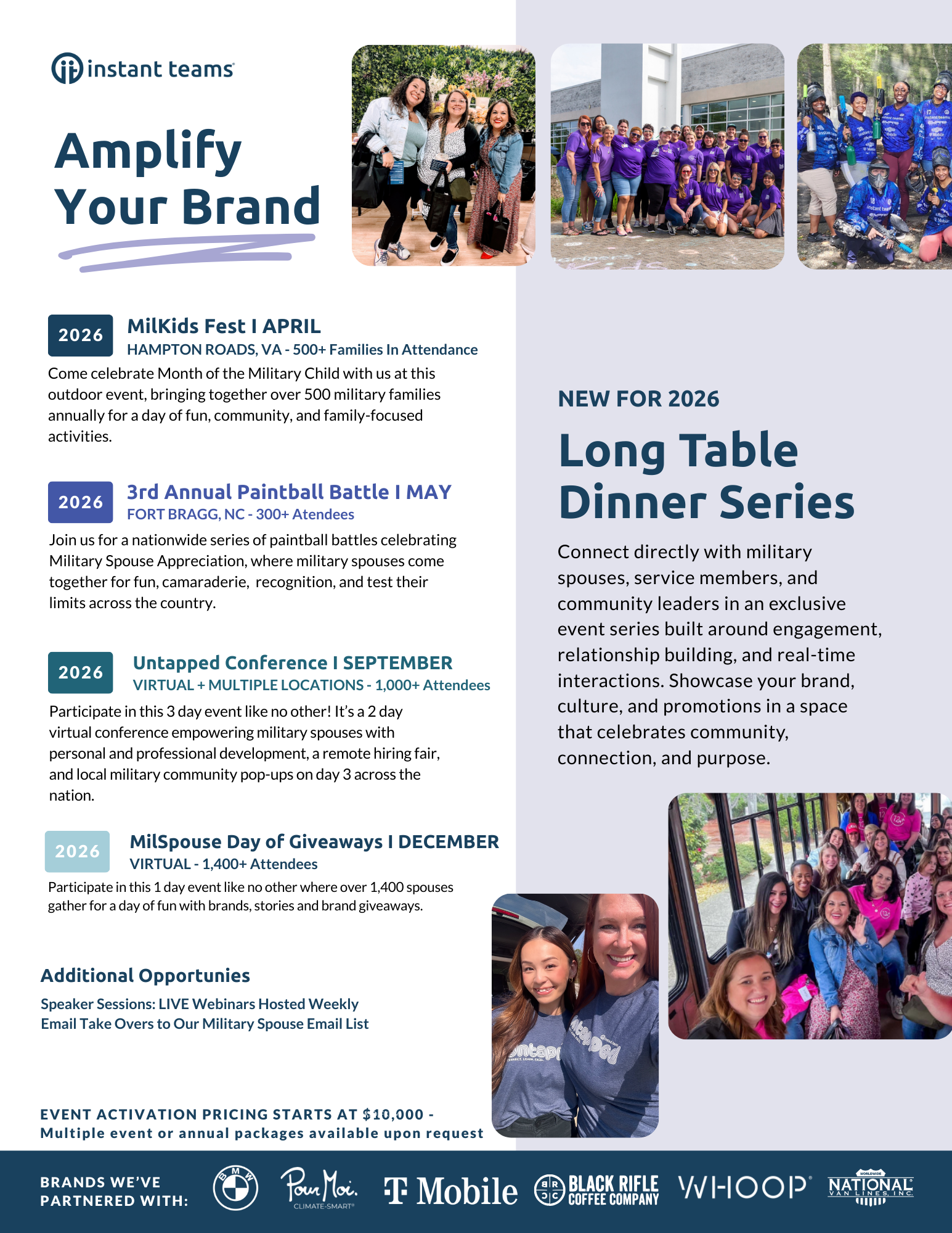 As military spouse community experts, we thrive on showcasing dedicated brands like yours front and center. Partner with us, and together we’ll deliver unforgettable experiences, meaningful connections, and endless opportunities to our vibrant community. Let us do the heavy lifting while your brand takes the spotlight!
